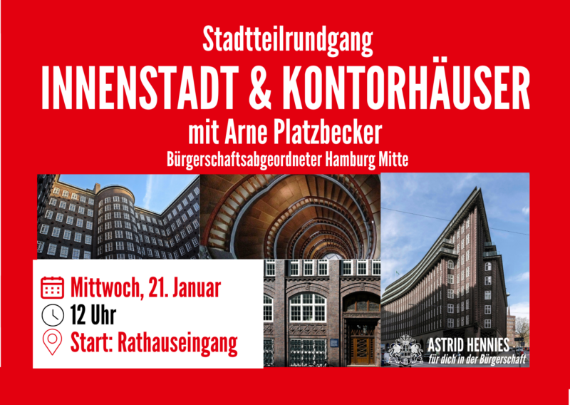 Die Bürgerschaftsabgeordnete Astrid Hennies lädt gemeinsam mit ihrem Bürgerschaftskollegen Arne Platzbecker aus Hamburg Mitte am Mittwoch, den 21. Januar 2026, herzlich zu einem Rundgang durch die Hamburger Innenstadt ein. Der Rundgang steht unter dem Titel „Innenstadt im Wandel – vom Kontor zur Konfliktzone“ und führt durch die historische Altstadt […]