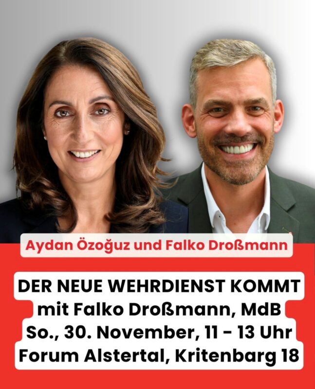 Zu diesem Thema lädt die Wandsbeker Bundestagsabgeordnete Aydan Özoguz gemeinsam mit ihrem Bundestagskollegen Falko Droßmann zu einem Informationsaustausch in das Forum Alstertal in Poppenbüttel ein. Was bedeutet der neue Wehrdienst für junge Menschen, für unsere Sicherheit und für die Gesellschaft? Was ist genau geplant? Kommen Sie vorbei und stellen […]